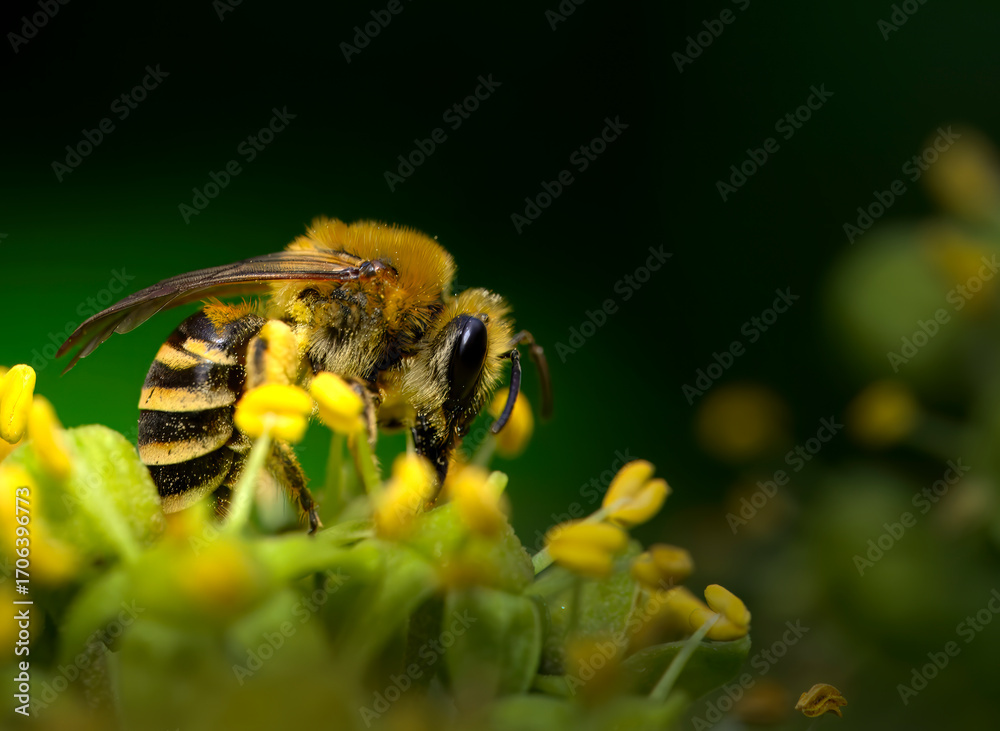 Macro shot of a bee (Apis) sitting on ivy flowers and harvest pollen. #1706396773