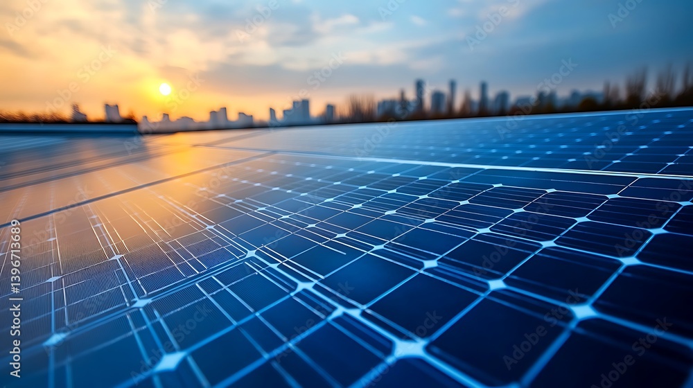 Macro shot of a modern solar panel surface, showing fine grid lines and blue photovoltaic cells reflecting direct sunlight. #1396713689