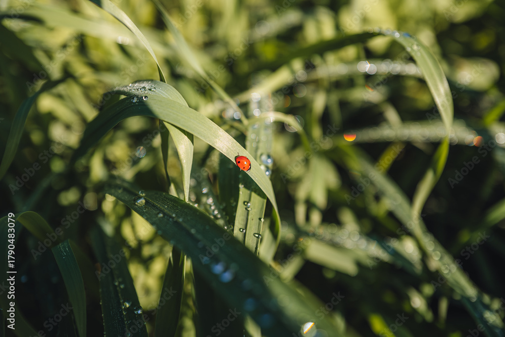 Macro shot of a red ladybug on a green leaf in the countryside #1790483079