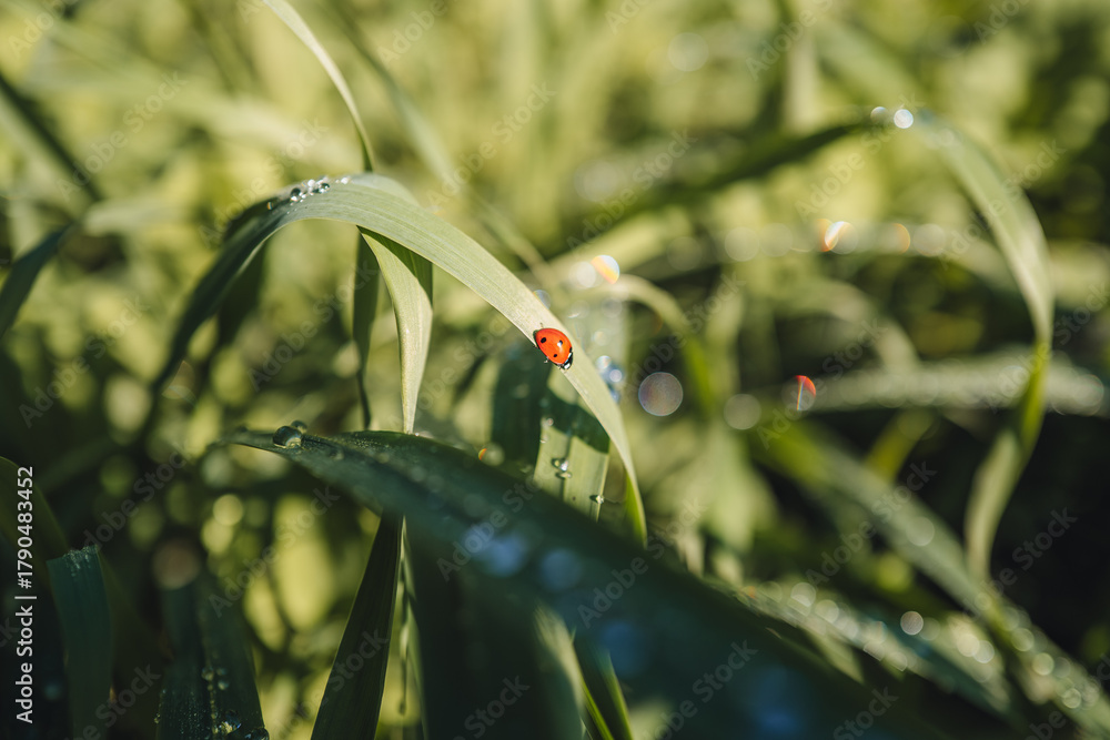 Macro shot of a red ladybug on a green leaf in the countryside #1790483452