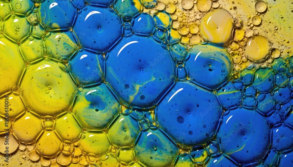 Macro shot of oil and water creating an abstract background of blue and yellow bubbles. Perfect for science, art, or technology concepts. #1908610016
