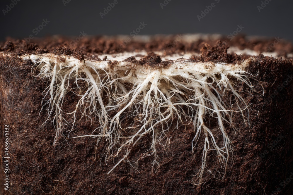 Macro shot of plant roots in dark brown soil reveals intricate biodegradable network in rich organic detail. #1636575132