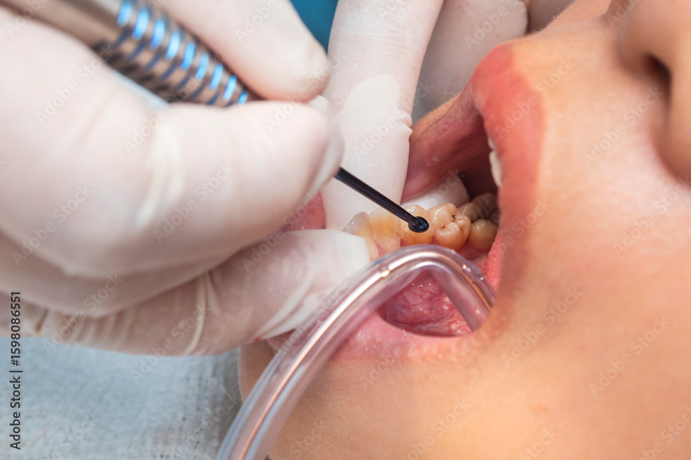 Macro view of dental professional inserting composite into a lower premolar cavity using a delivery tip during filling procedure. #1598086551