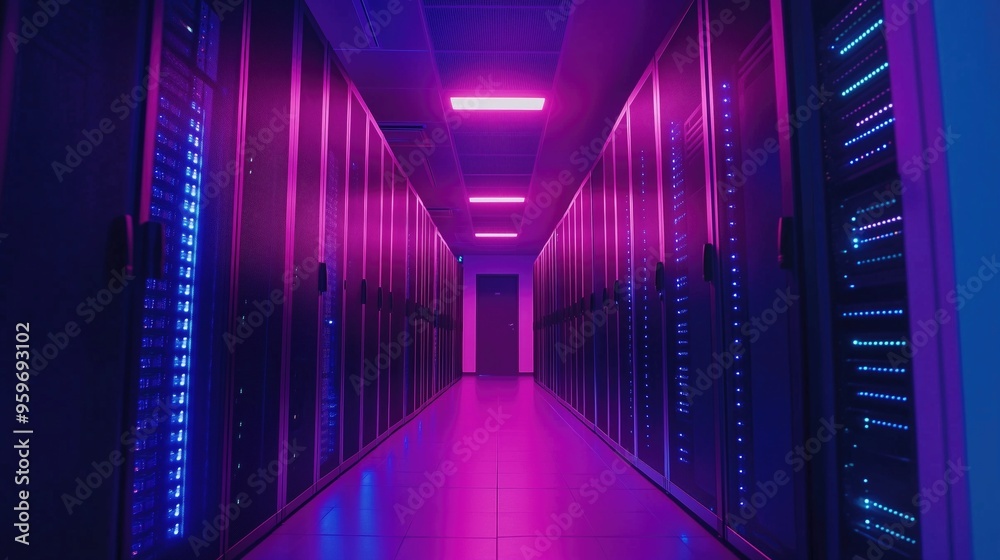 Magenta and dark blue data centre server room at night for big data storage #959693102