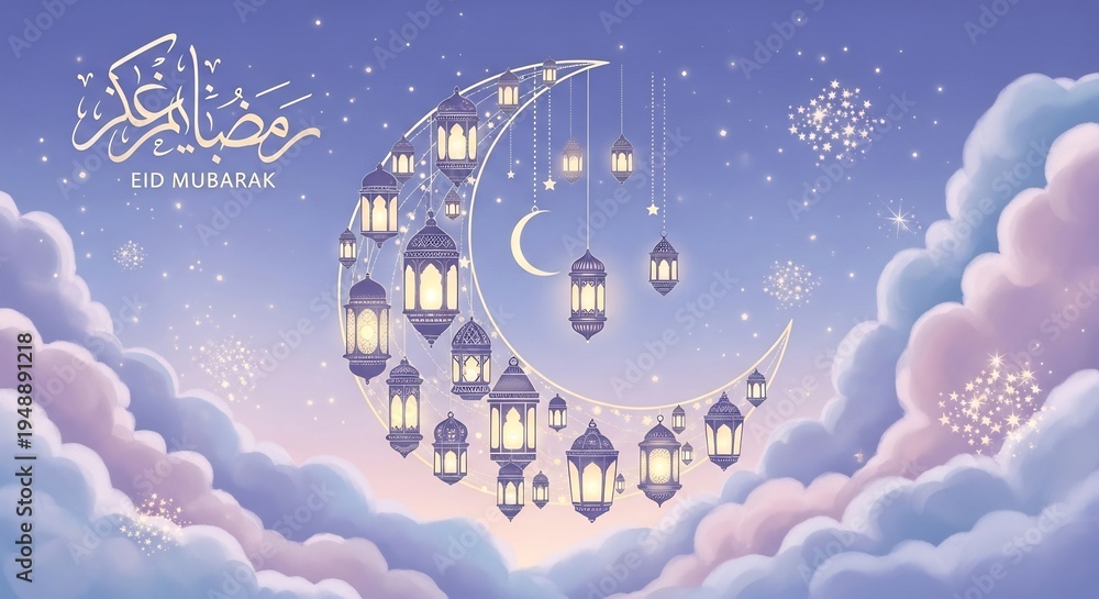 Magical Eid Mubarak scene with crescent moon, glowing lanterns, and fluffy clouds, digital painting, starry night, Islamic celebration, serene atmosphere, soft illumination #1948891218