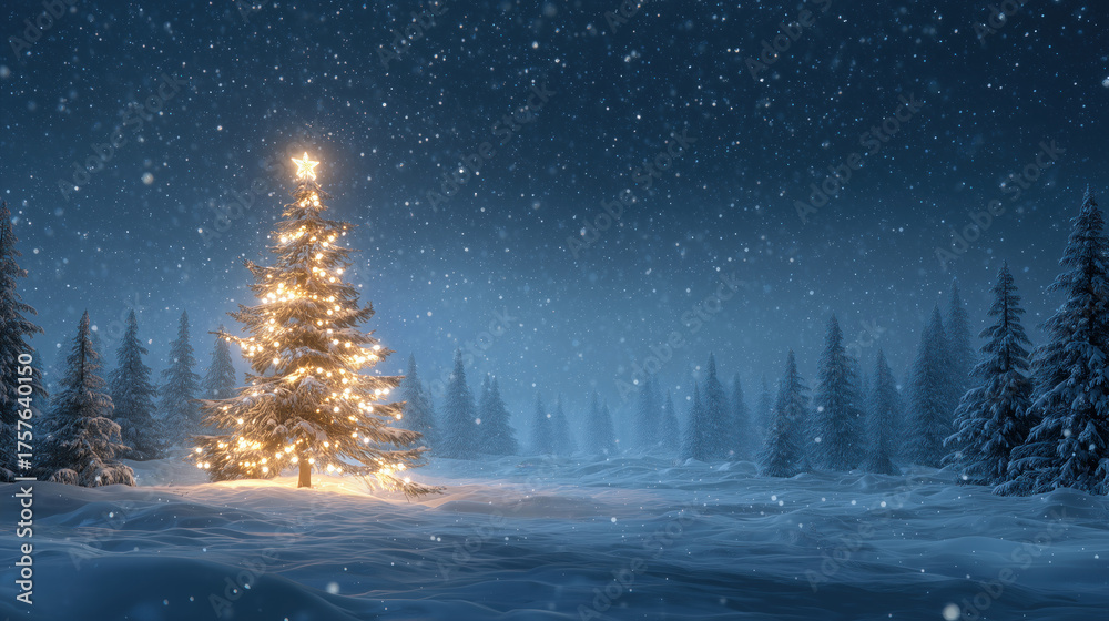 Magical Winter Night Scene with Glowing Christmas Tree in Snow-Covered Forest #1757640150