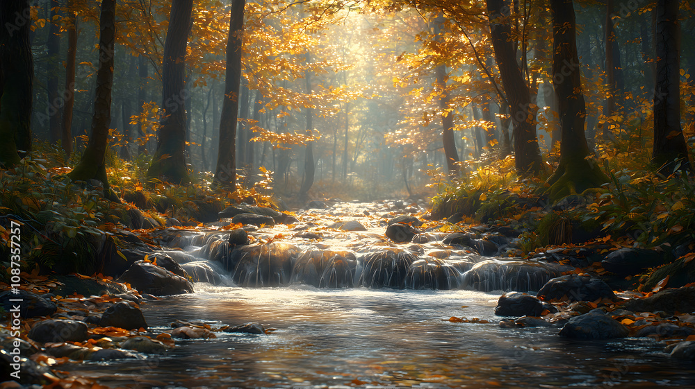 Magnificent nature scenic landscape of autumn season forest with creek flowing,waterfall #1087357257
