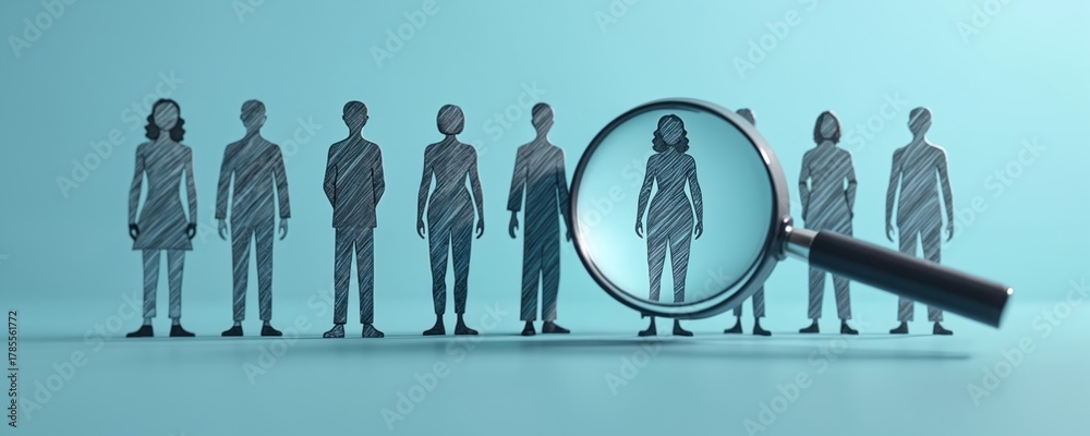 Magnifying glass focuses on one person silhouette from the group. Symbol of talent search employee recruitment. Concept of selection finding the best candidate for the job. #1785561772
