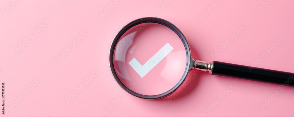 Magnifying glass highlighting a check mark symbol on a soft pink background, representing verification, approval, and successful inspection in a minimal style. #1775933788