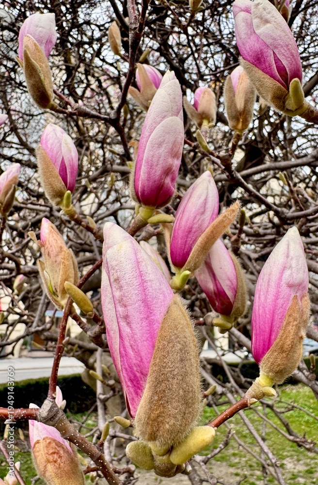 Magnolia tree shows buds ready to bloom in spring season in a city park during daylight hours #1949143769