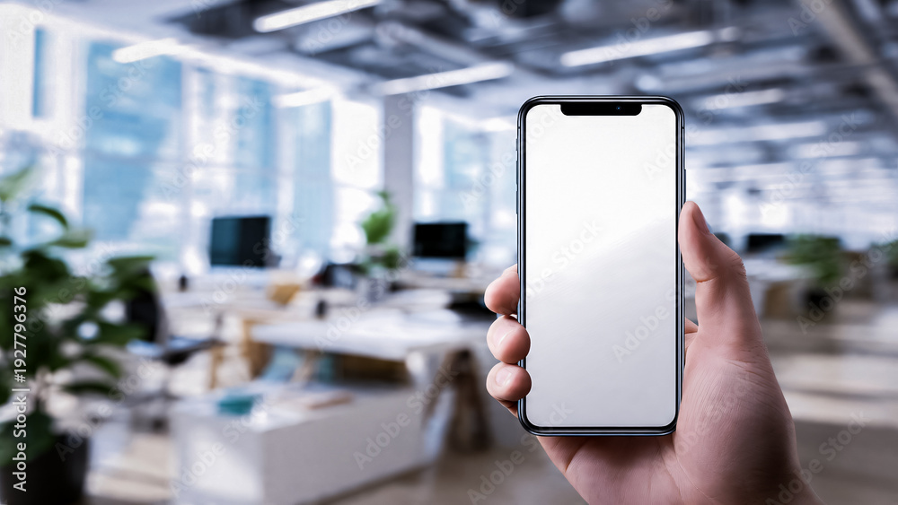 Main tenant un smartphone avec écran blanc avec arrière plan de bureau #1927796376