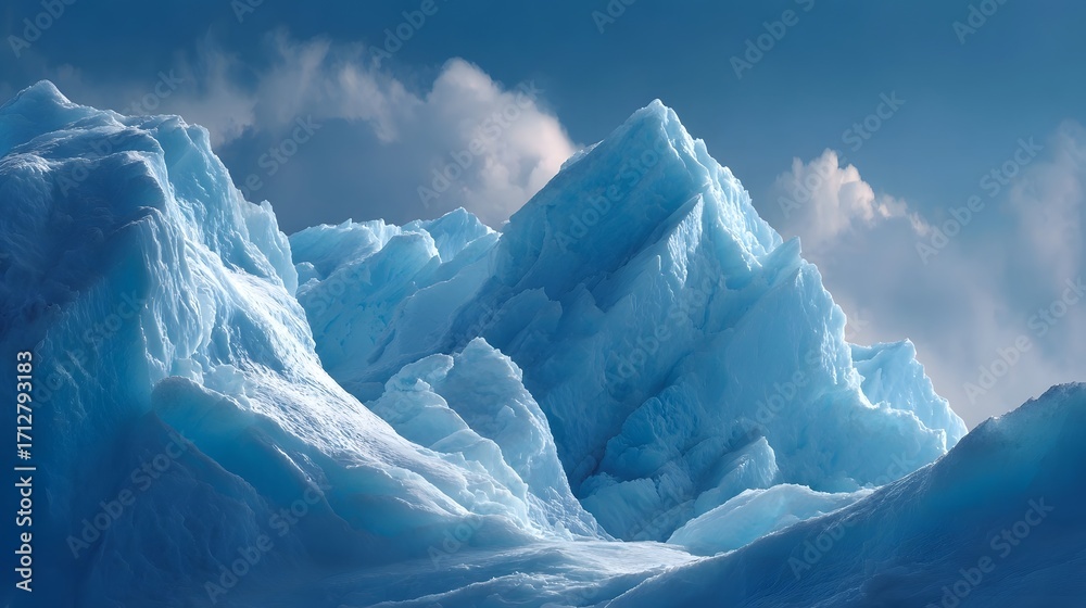 Majestic and dramatic polar landscape featuring sharp jagged blue ice formations and glaciers sculpted by nature under a vast sky with dynamic clouds #1712793183