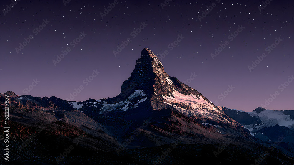 Majestic Matterhorn mountain peak illuminated by soft light under a starry night sky creates a serene and awe-inspi landscape in the Swiss Alps. #1522217877