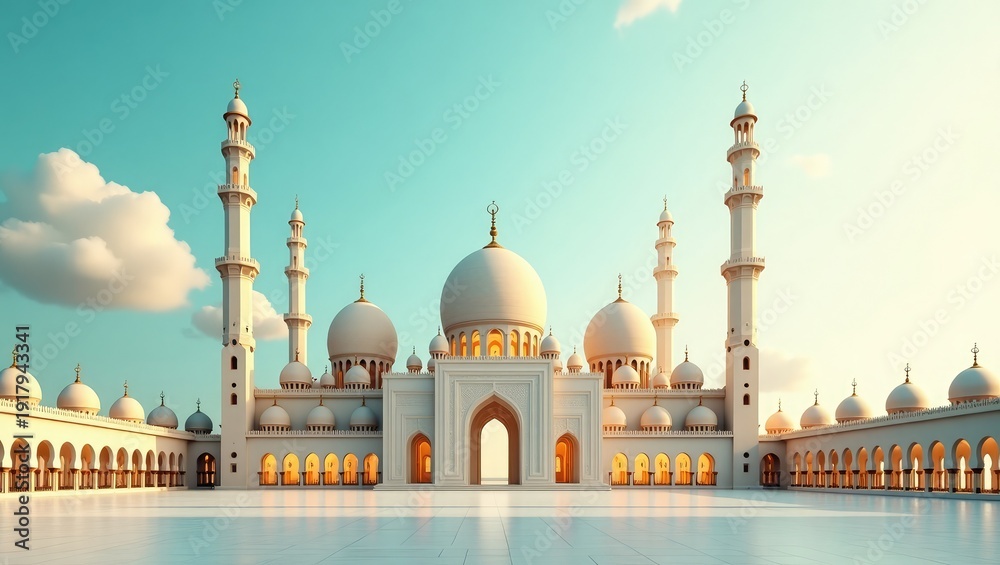 Majestic mosque with domes and minarets in a serene landscape golden light reflecting off white architecture under a blue sky with clouds #1917943341