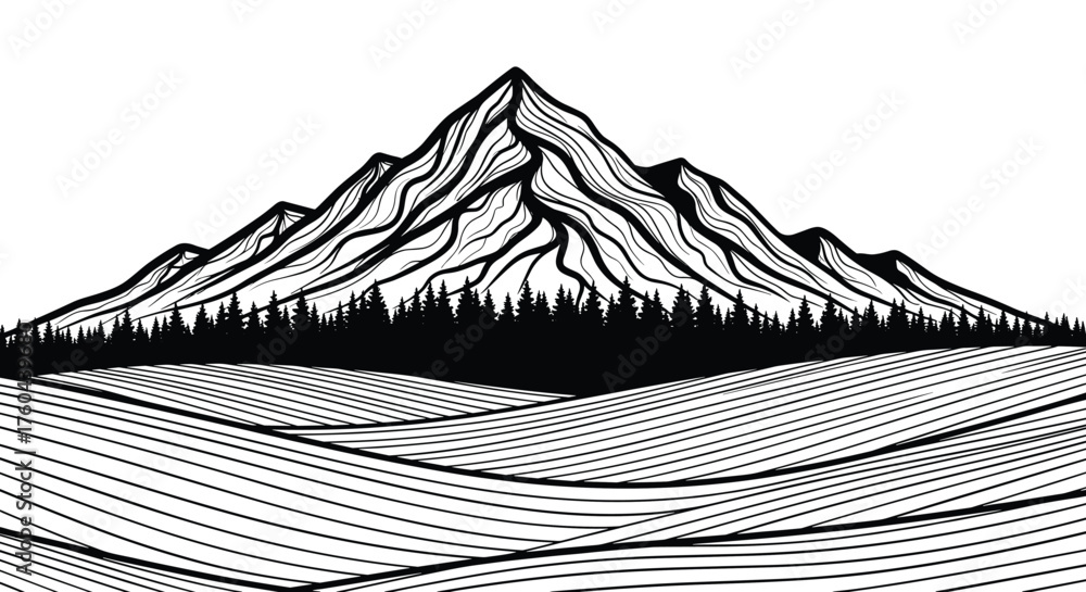 Majestic Mountain Peaks Landscape with Wavy Fields and Forest Silhouette, a Minimalist Vector Illustration for Nature Tourism, Outdoor Adventure, and Tranquil Escape Promotion, Ideal for Travel and Ad #1760439680