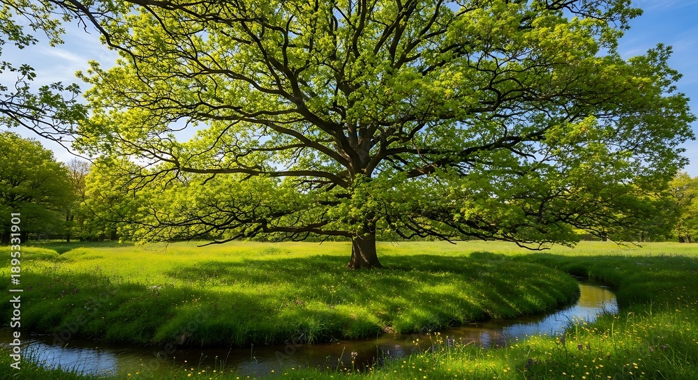 Majestic Oak Tree by a Stream Lush Green Landscape Under Sunny Skies. #1895331901