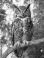 Majestic owl with piercing yellow eyes perched on a branch framed by soft green foliage. #1766534125