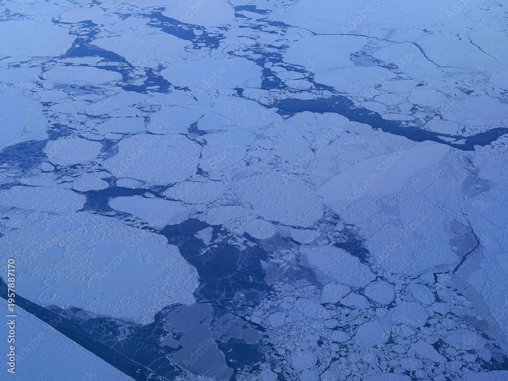Majestic sunset over the snow-covered mountains and ice floes of the East Greenland coast, viewed from above. #1957887170