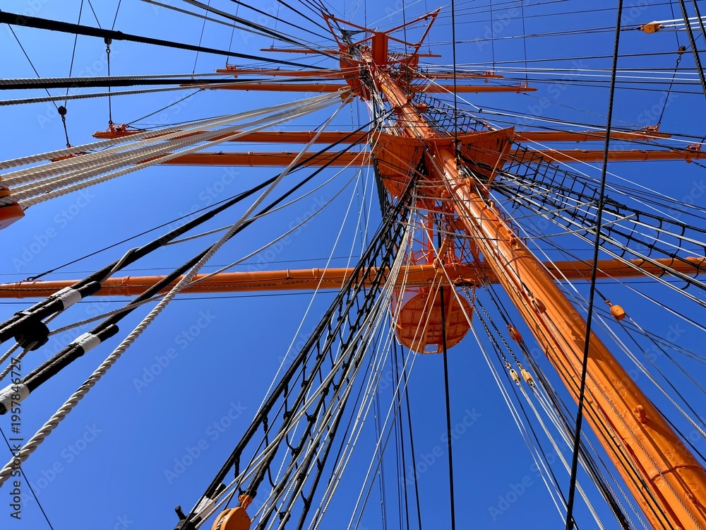 Majestic view of the tall ship Kaiwo Maru and Shinminato Bridge against the snowy Tateyama Mountains in Toyama, Japan. #1957846727