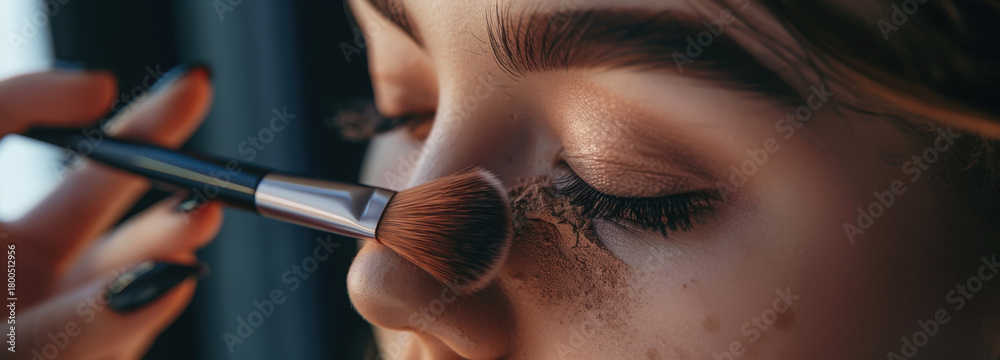 Makeup Application: An up-close shot of a beauty treatment in progress, with a skillful hand applying makeup to a person's eye #1800512956