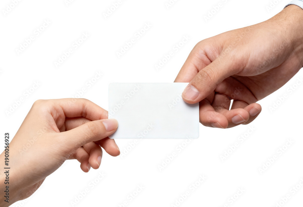 Male and female hands exchanging a blank white business card. Isolated on transparent background, png #1901056923