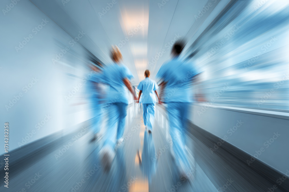 Male and female nurse rush to an emergency with motion blur in hospital #1714282258