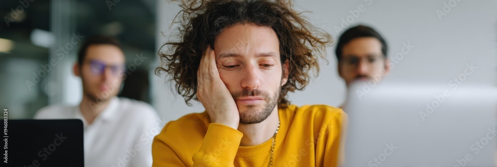 Male caucasian young adult in yellow sweater leaning on hand looking bored at laptop in classroom or office with colleagues blurred behind him conveying distraction and disengagement #1946883324