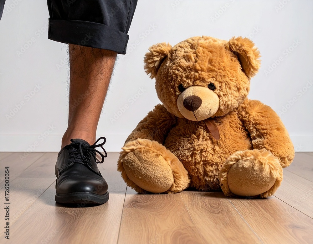 Male Foot Nudging Large Teddy Bear – Conceptual Symbol of Tension and Aggression #1726000354