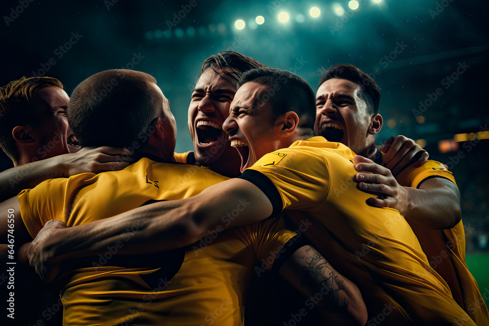 male Soccer players in a crowded soccer stadium celebrating a goal #646746550