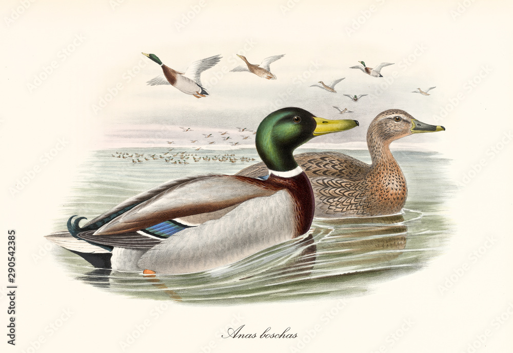 Mallard (Anas platyrhynchos) aquatic bird swimming in the water to the right with another exemplar while a flock flyes far on background. Detailed vintage art by John Gould publ. In London 1862 - 1873 #290542385