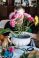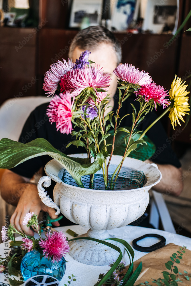 Man arranges bright aster flowers in ornate white pedestal urn. Sustainable mechanics, green living, garden-to-vase, environmentally conscious hobby. #1926305246