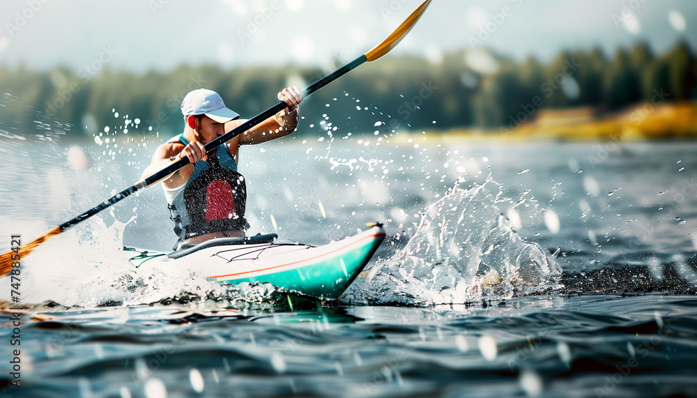 Man athlete takes part championship of canoe racing, kayak racing. Outdoor sport, canoeing competition race . Strong sport man canoeist rowing in water of river. #747885421