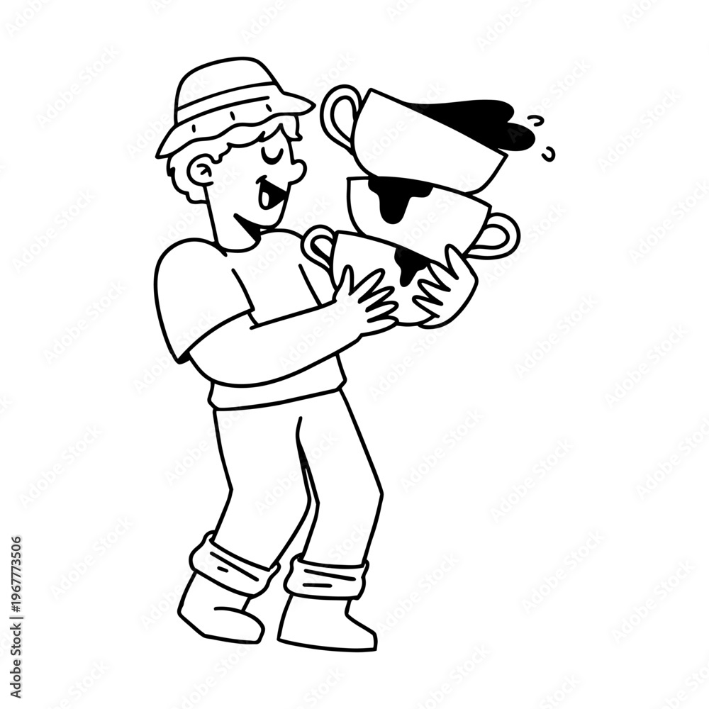 Man Balancing Stack of Multiple Takeaway Coffee Cups Hand Drawn Doodle Style Illustration #1967773506