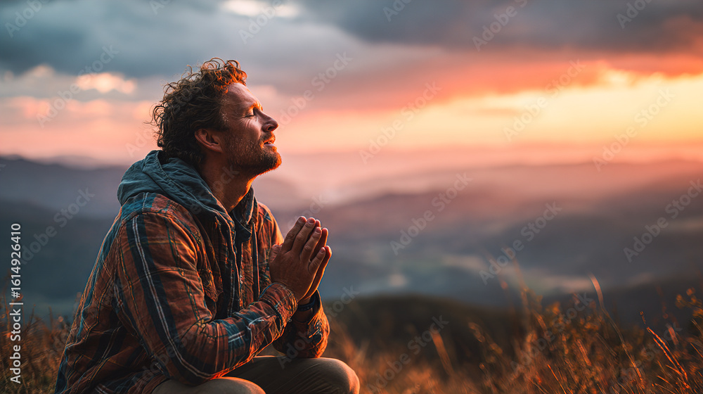 Man finds peace in nature, praying at sunset over mountains, seeking hope and gratitude with stunning scenic backdrop for wellness retreats #1614926410
