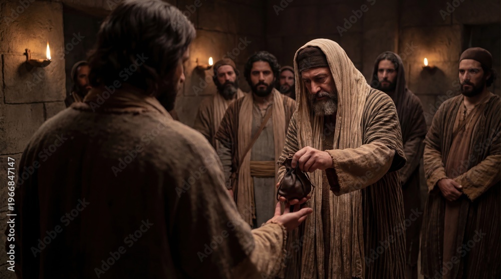 Man giving a money bag to another man, a biblical concept of betrayal and a moment from the evangelical events of Holy Week for christian art. #1966847147