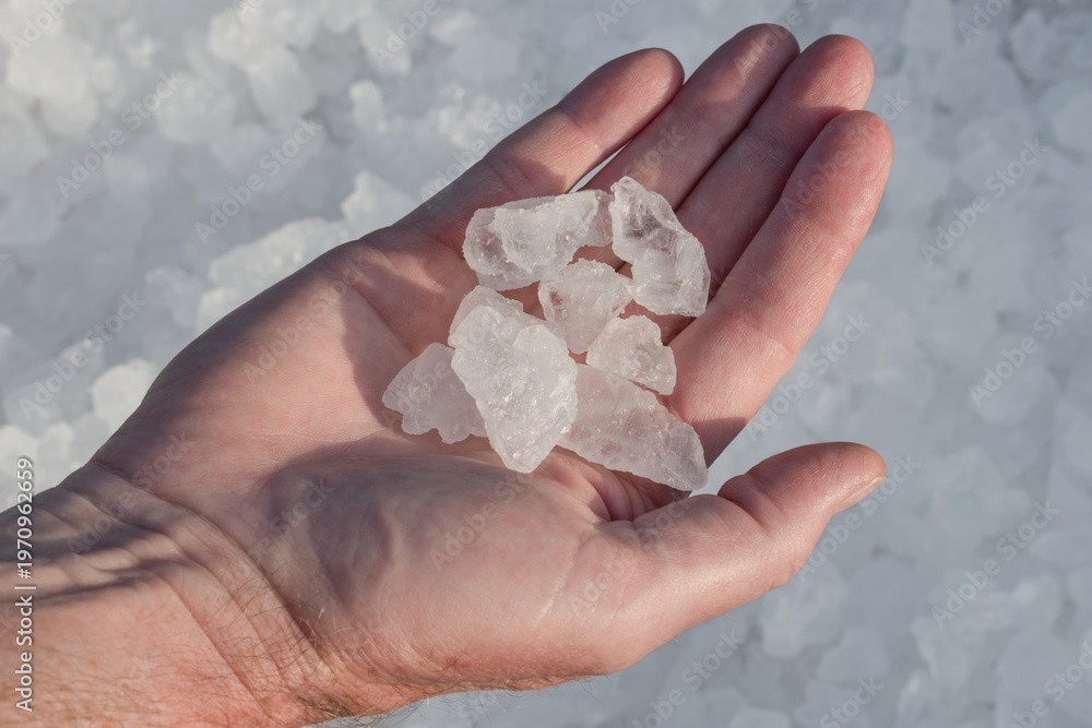 Man holding ses salt crystals in the hand, Bonaire, Caribbean Netherlands #1970962659
