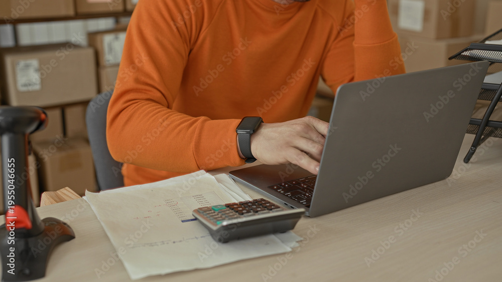 Man holds head and writes on invoice with pen beside laptop and calculator amid stacked cardboard boxes and barcode scanner in building; stress finances. #1955046655
