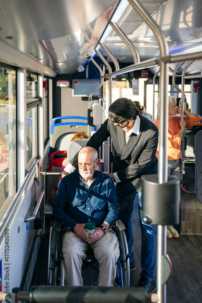Man in a sharp suit assisting a senior man in a wheelchair on a city bus, promoting accessibility for elderly passengers #1775240090
