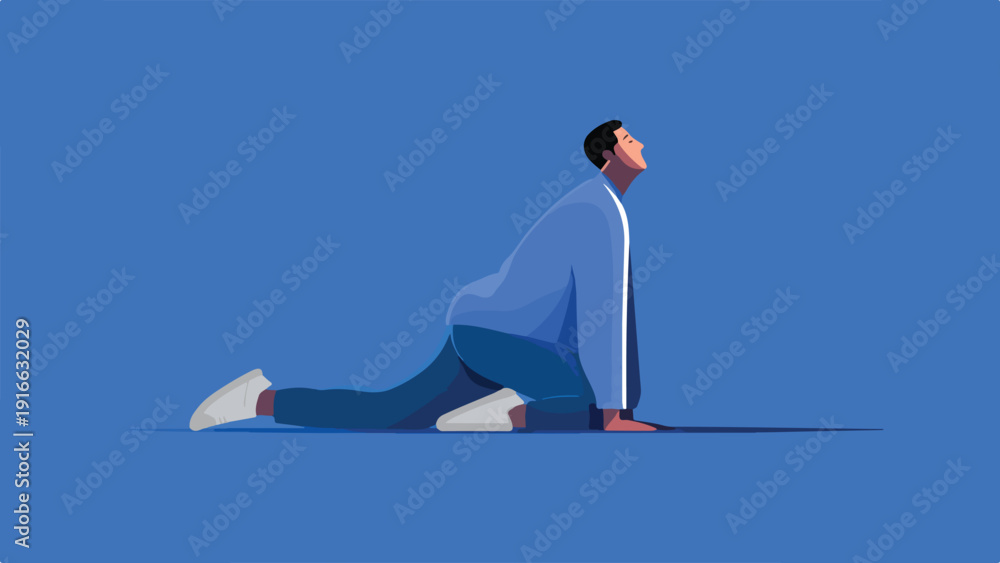 Man in blue shirt and pants performs a dynamic yoga stretch on a blue background #1916632029