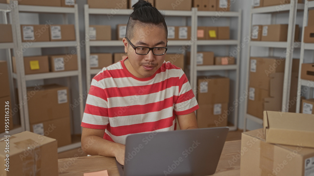 Man in striped shirt typing on laptop among parcel boxes with a fist pump gesture in storage building; small business success. #1955116336
