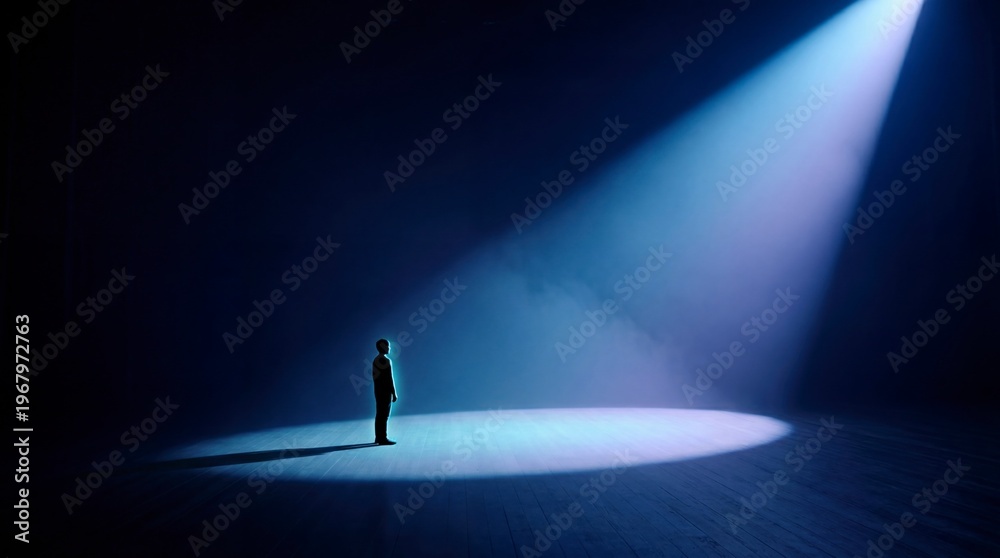 Man in the Spotlight: Silhouette of a person stands centered in a brilliant spotlight, evoking feelings of isolation, contemplation, and the weight of being observed. #1967972763