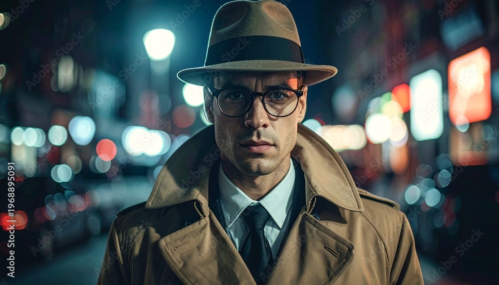 Man in Trench Coat and Fedora at Night. #1968895091
