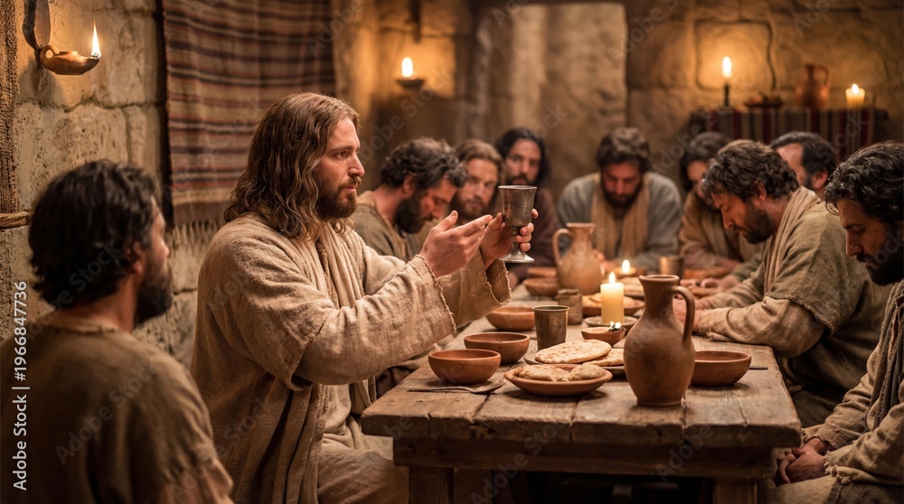 Man Jesus Christ holding chalice with disciples at table. Biblical last supper scene. Christian easter teaching. #1966847736