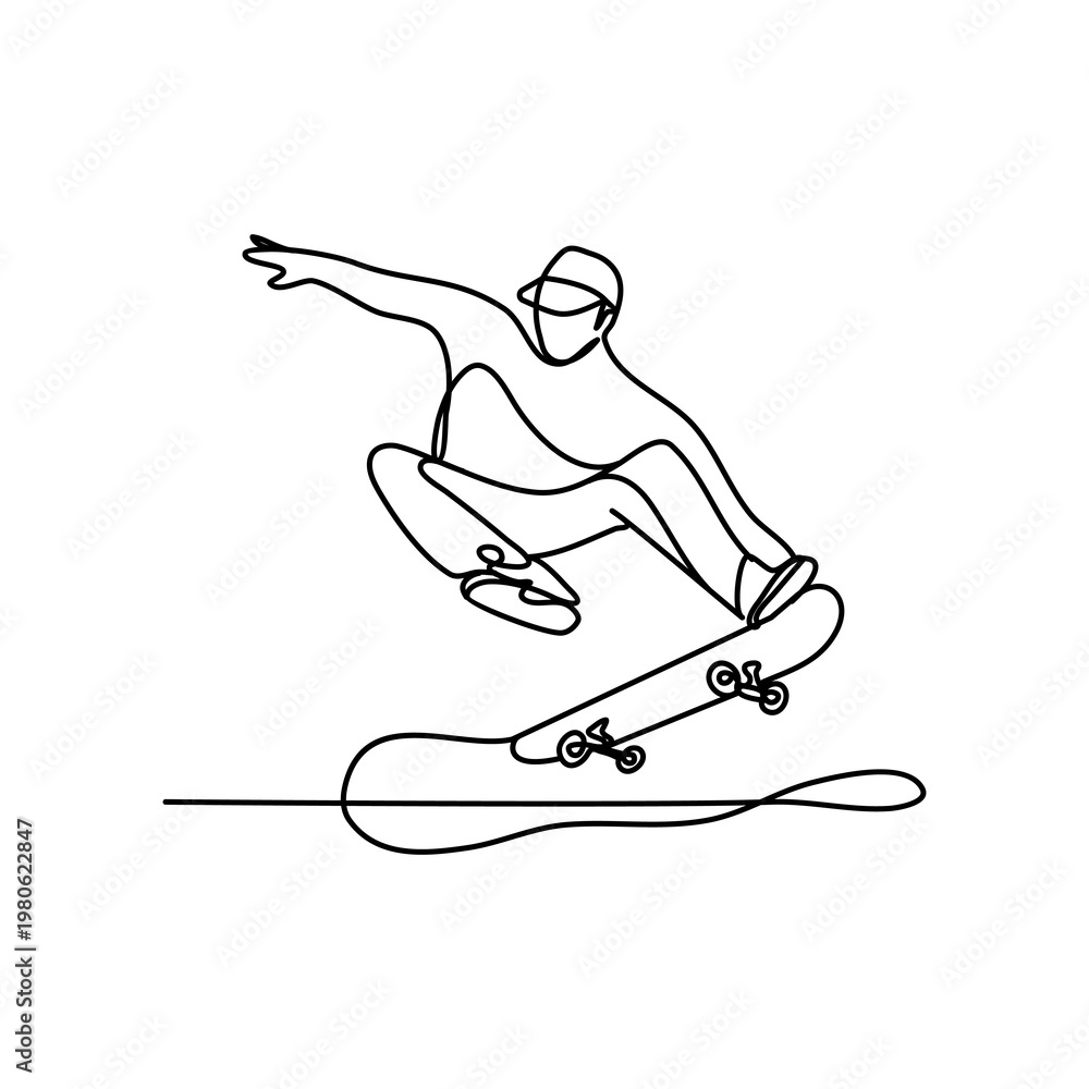 Man playing skateboard continuous one line drawing. Continuous line drawing of a young skateboarder performing tricks in a skate park. outdoor sports and skateboarding practice in a minimalist style. #1980622847