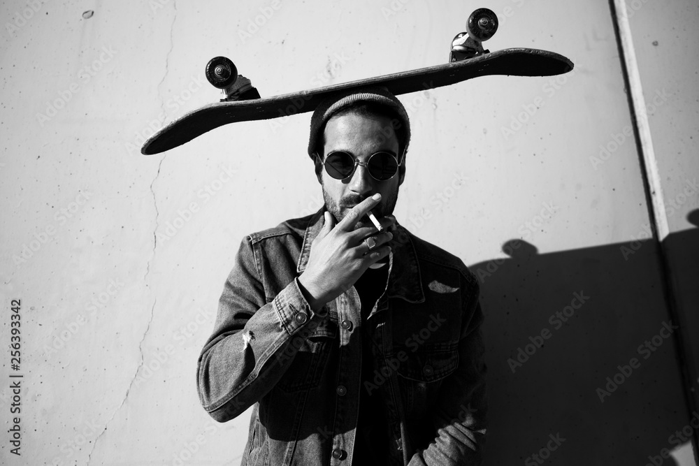 man posing on a urban wall smoking and wearing sunglasses with a skate on his head #256393342