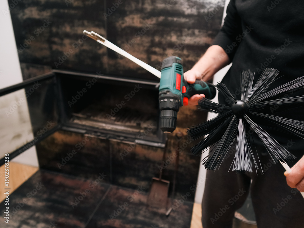 Man preparing to clean a modern indoor fireplace with a professional chimney brush. #1902378236
