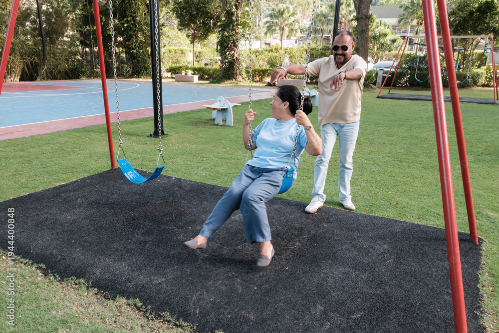 Man pushes woman on swing in park while enjoying sunny day outdoors with green grass and trees #1944400848