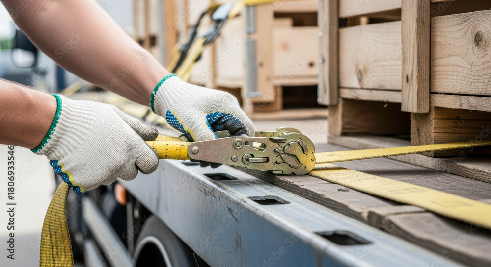Man securing wooden crates on truck cargo with ratchet tie down strap. Cargo transportation and logistics industry concept for delivery. #1806933546