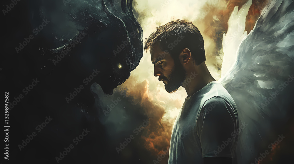 Man stands pensive expression as black devil whispers his left shoulder and white angel his right. dramatic light illuminates apocalyptic backdrop enhancing moment. Whispering Light. Illustration #1329897582