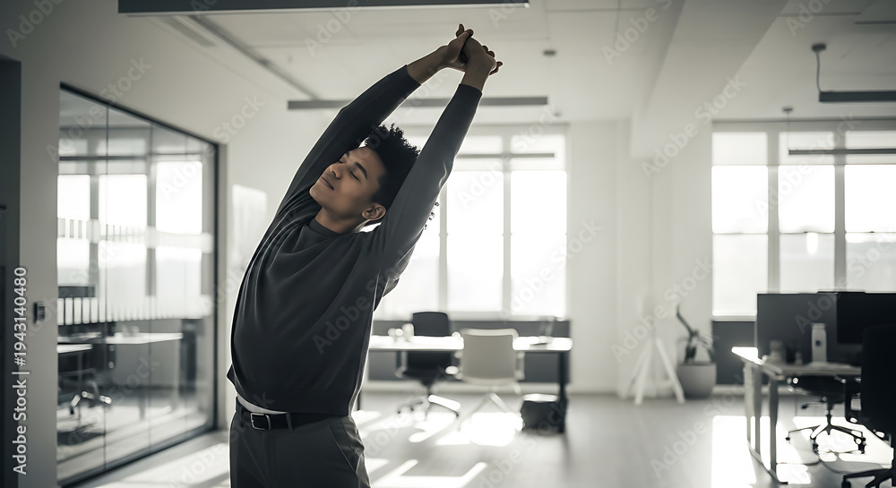 Man Stretching in Modern Office for Workplace Wellness. #1943140480